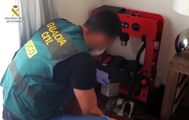 Igualmente se realizaron varios registros domiciliarios, donde se intervinieron más cantidades de Cocaína y metanfetamina, sustancias de corte como la fenacetina, 23.000 € en metálico y una pistola real municionada, dispuesta para su uso, además de una prensa hidráulica y todo tipo de moldes y accesorios necesarios para la adulteración de la cocaína.
